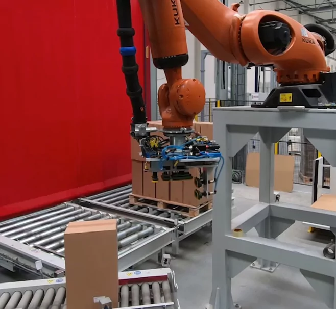 - Zwiększenie wydajności linii – paletyzacja robotem przemysłowym zwiększa wydajność procesu, co daje sprawniejszą dystrybucję produktu w krótszym czasie oraz szybki zwrot z inwestycji,
