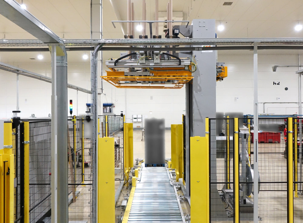 Description of the cell’s operation: In the initial stage, the operator scans the collective label using a hand-held barcode scanner. The received product code is sent to the client’s superior system, which returns detailed data about the pallet. After scanning, the pallet is automatically transported to the station and labels are added to the packaging. The truck operator collects the taped pallet and passes it on to further processes.