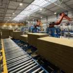 Elastyczne roboty przemysłowe wyposażone w chwytaki do depaletyzacji arkuszy wełny oraz przekładania palet na miejsce odbioru przez operatora.