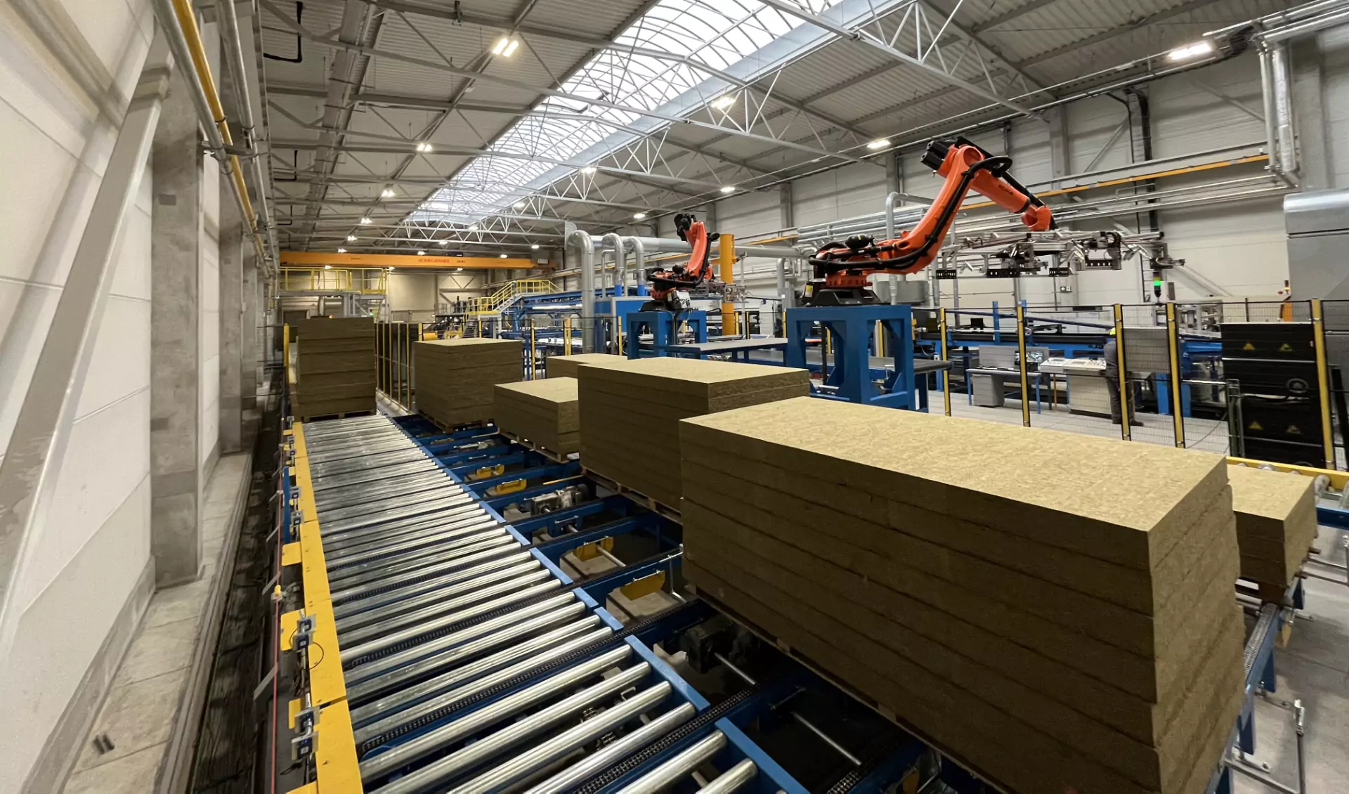 Na linię wprowadzane są palety z arkuszami wełny mineralnej, bezpośrednio z samochodu ciężarowego. Roboty depaletyzują arkusze z 4 punktów poboru i umieszczają je na przenośnik taśmowy do dalszej obróbki w zakładzie. Automatyzacja zwiększa tempo depaletyzacji oraz obniża jej koszty, ponieważ mniej osób jest zaangażowanych w ten proces.